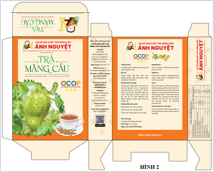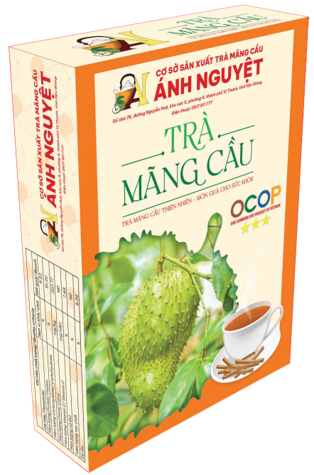 Khác biệt với các bao bì dạng túi ép trước đó, kiểu dáng công nghiệp lần này là một hộp giấy 3D được thiết kế công phu. Hộp sử dụng tông màu chủ đạo là cam và kem, tạo cảm giác ấm áp, thân thiện và sang trọng. Thiết kế tập trung làm nổi bật thông điệp “Trà Mãng Cầu Thiên Nhiên – Món quà cho sức khỏe” cùng hình ảnh minh họa ly trà và trái mãng cầu tươi tắn, giúp sản phẩm dễ dàng thu hút ánh nhìn ngay từ lần đầu tiên.