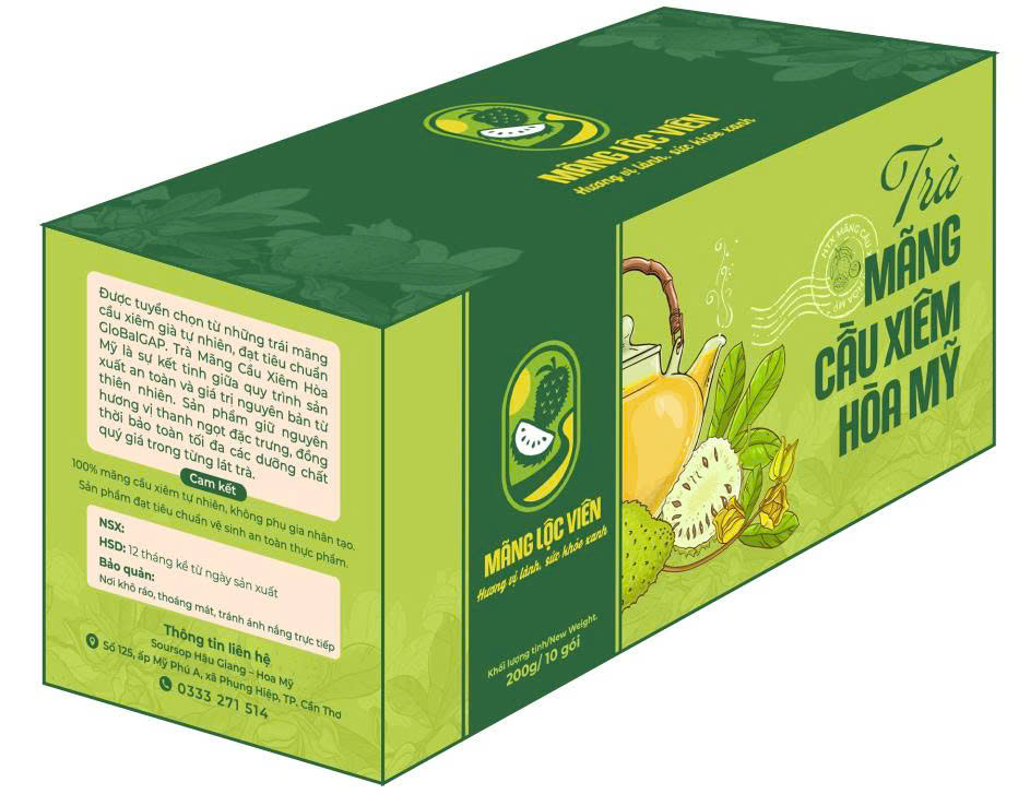 - Nhãn hiệu: Kết hợp hài hòa giữa hình ảnh trái mãng cầu tươi ngon, biểu tượng dòng sông Hậu Giang và thông điệp hướng đến sức khỏe.