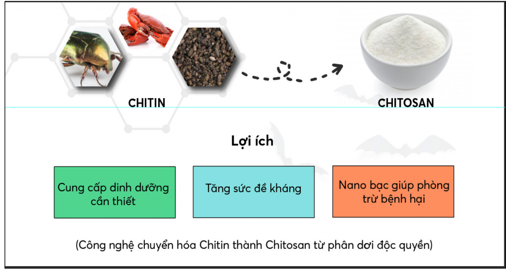 Tận dụng nguồn nguyên liệu sẵn có tại địa phương và kết hợp công nghệ nhũ hóa Chitin cho ra mắt dòng sản phẩm phân bón lá Chitosan được chuyển hóa từ phân dơi, vừa có giá trị dinh dưỡng cao vừa có tác dụng kích hoạt các cơ chế phòng thủ cho cây trồng, tăng sức đề kháng cho cây.