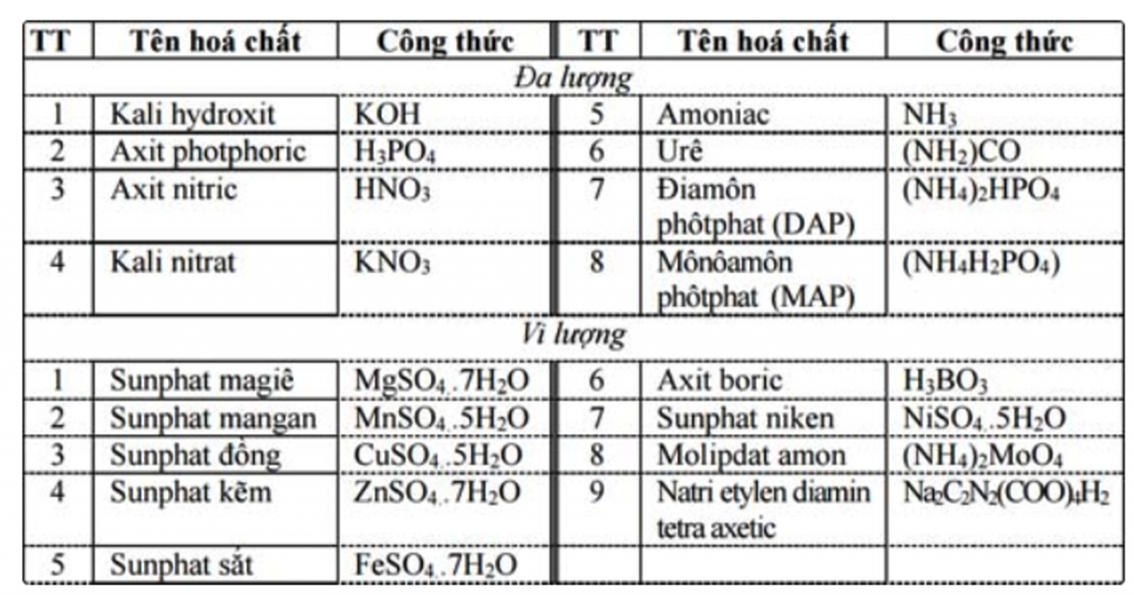 Bảng 1. Nguyên liệu khoáng sử dụng trong sản xuất phân bón lá.