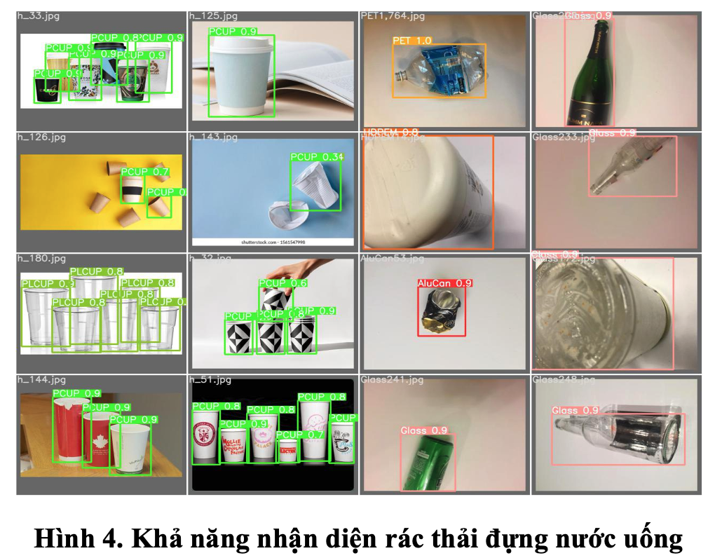Với việc nhận diện rác thải đồ uống được áp dụng “Reverse Vending Machine”, mô hình Deep Learning (học sâu) có kiến trúc được xây dựng đặc biệt với độ chính xác IoU là 0.9524 trên tập Validation và tốc độ 2.7 ms: chai nhựa, chai thủy tinh, lon thiếc, ly giấy và ly nhựa