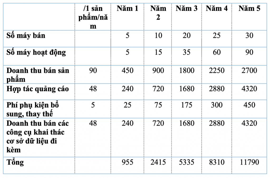 Đối với riêng sản phẩm “Reverse Vending Machine”( Tiến độ hoàn thành 80%) trong hệ sinh thái các sản phẩm, dự đoán kết quả kinh doanh về doanh thu, chi phí và lợi nhuận trong 5 năm được thể hiện ở các bảng sau: