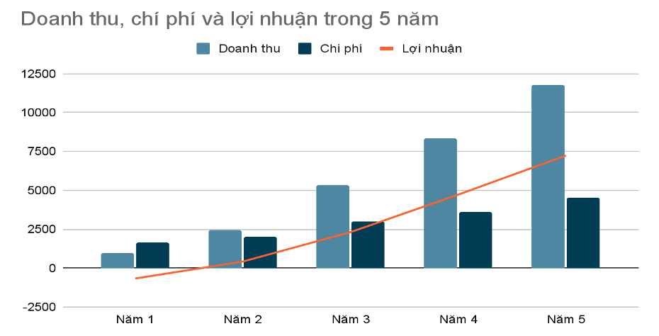 Biểu đồ doanh thu, chi phí và lợi nhuận dự đoán trong 5 năm (đơn vị: triệu đồng):
